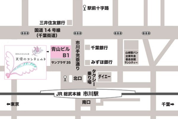 * 中央・総武線 JR市川駅から「天使のコンチェルト」までは、北口ロータリー側に出て国道14号方面へ徒歩1分。